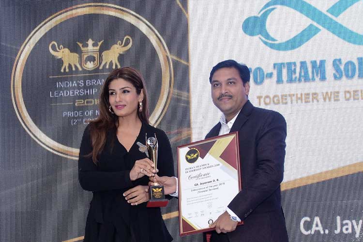 Our CEO, Mr. CA Jayaram D R, a respected leader with extensive expertise in accounting and finance, was honored with the “Entrepreneur of the Year 2018” award at the India’s Brands and Leadership Awards, held in May 2018 at Leela Ambience, Gurgaon. The award, presented by renowned Bollywood actress Mrs. Raveena Tandon, recognizes his visionary leadership, professional excellence, and significant contributions to the accounting and business consulting sectors. This achievement reflects the strong foundation of Pro-TEAM Solutions, driven by a mission to deliver high-quality services with complete accountability, efficiency, and reliability across locations. Supported by a specialized and dedicated team, we consistently deliver excellence in every engagement, strengthening our market position year after year.